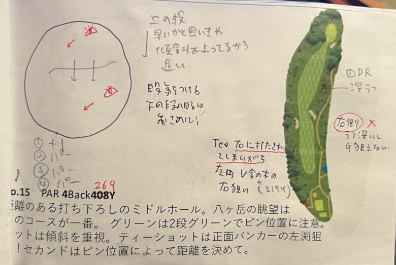 同組のメンバーのショットも参考にして「ここはティーの向きが右向いてる」とか「このうち下ろし、身体がつっこむぞ!要注意」など自作のコースガイドに書き込んでいきます。参考までに私の作っているお手製コースガイド(ネットからコースガイドをパワポに落としてカラー印刷して綴じて作ってる)の書き込みと特別公開しちゃいます!