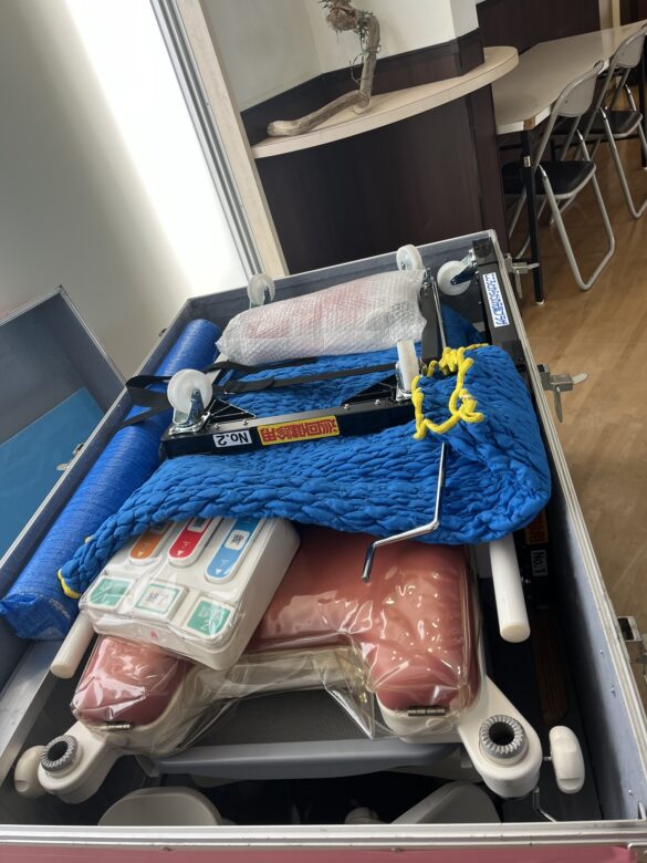 ここで、どうして婦人科検診で私を入れて7名という大所帯なのか?ということが判明。スタッフの内訳は1名リーダーHさん、婦人科Ns2名、MMG(マンモグラフィー)放射線技師(女性)2名、MMG車ドライバー男性1名、婦人科医師(Dr.ORANGE)です。さて、ここからが大変でした。診察室のセッティングです。この施設は病院ではなく、避難島民の宿泊施設。なので、本来なら居室である和室にブルーシートを敷き、婦人科内診台を設置し、各診察用グッズ(膣鏡やら超音波やら)をセッティングするのです。