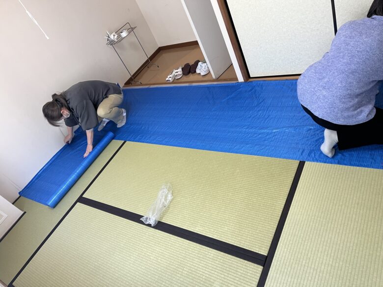 こんな感じで畳の上にブルーシートを敷く