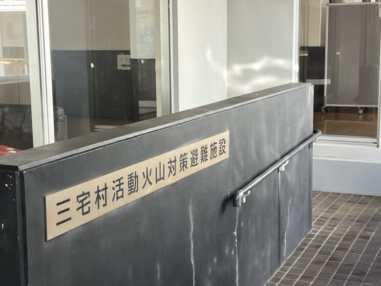 バンに乗り込み、順調に走り出した検診グループ一行。ここからてっきり宿に荷物を置いて一休み・・かと思っていたのですが、しばらく走ったバンは学校の近くで右折。細い道に入りどんどん上っていき、まあまあ立派な建物の前で停まりました。表記を見るとここは三宅島の避難所。ここが検診会場だったのです。三宅島噴火のための避難所ですから、平時の今は誰もおらず、ガランとしています。