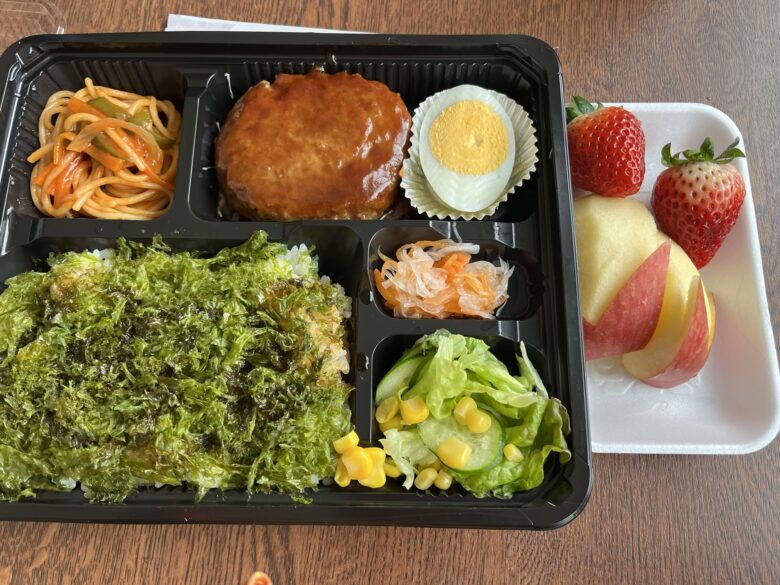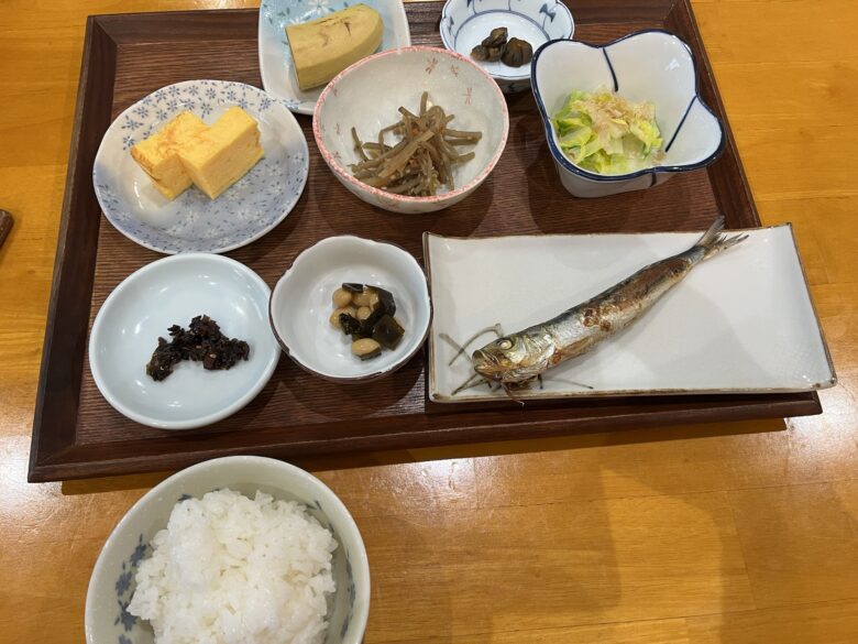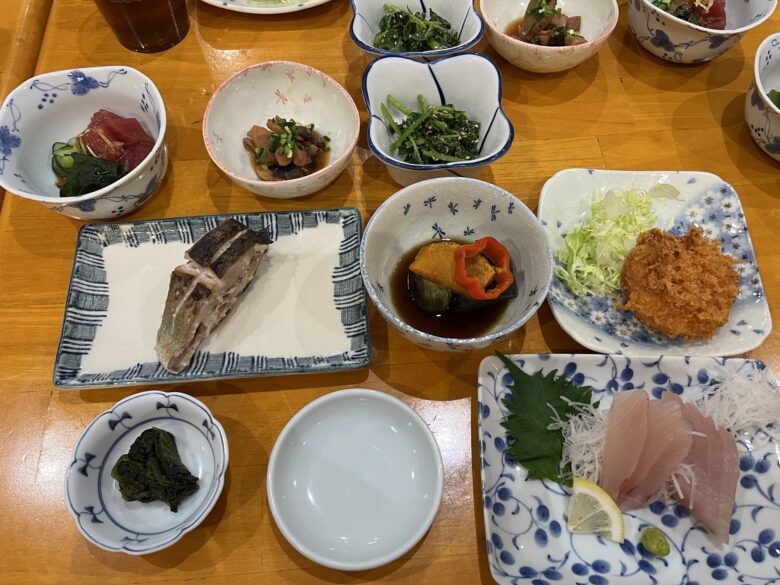 さて、島での食事はどんな感じか?ですが、全部載せるのも冗長なので、朝・昼・夕食を1食ずつご紹介します。宿では朝食・夕食を、昼は仕出し弁当でした。夕景は釣り宿でもあるので、お魚多めでした。天候不良で船が3日間欠航しており、心配しましたが充分な量の食事が出ました。夜はハイボールなども飲んだりして、スタッフといろんな話で盛り上がりました。(夕食後はそれぞれの部屋に戻ったので、深酒をすることはありませんでした)