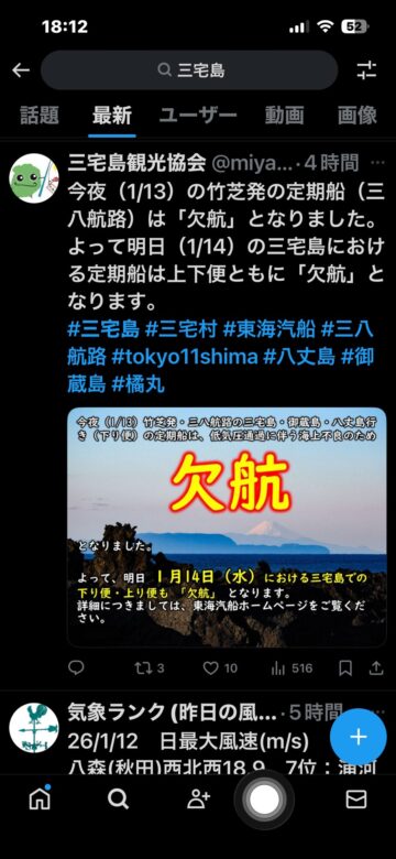 そんな感じで三宅島を堪能したわけですが、来島した翌日から伊豆諸島を爆弾低気圧が襲います。毎晩ベッドに入っても、轟々と風や波の音、時々雨の音が聞こえます。食堂でついているNHKでも、強風のニュースの1位に三宅島にあがるほどです。今回の検診ツアーでは、前述したように3日目に放射線技師さんが帰京し、代わりに超音波技師さんが来島する予定。しかし、風がひどくて船は欠航するし、飛行機も飛ぶか飛ばないかギリギリまで「天候調査中」のまま。イメージでは船の方が確実で飛行機の方が飛ぶかどうか不定かと思ったら逆でした。たしかに波が荒いと絶対に着岸できないのがわかったのですが、船もダメ飛行機もダメだと完全に詰むんですね・・