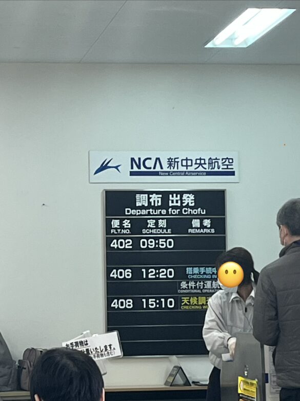 超音波技師さんと2人でバンに乗り込み、一路三宅島空港へ。時々パラパラと雨がフロントガラスに付きますが空は晴れています。上空の不安定さが示唆されます。三宅島空港に到着してチェックインして、荷物計って預けますが、空港のスタッフは当たり前のように荷物を受け取ります。まだ表示は「天候調査中」のまま。大丈夫かな・・・スタッフによると着陸さえすれば(機体が島に届けば)とぶことはほぼ確実とのこと。
