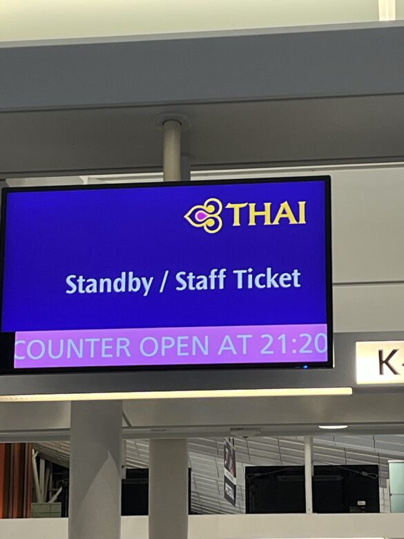 タイ航空のカウンターはまだ暗く、スタッフの姿もありません。電光掲示板には「カウンターは21:20に開きます」と。フムフム、3時間前にならないとダメなのね・・あと1時間以上あるよ・・・でも、一刻も早く預けたいので4-5人目くらいに並んで、YouTube見ながら過ごします。