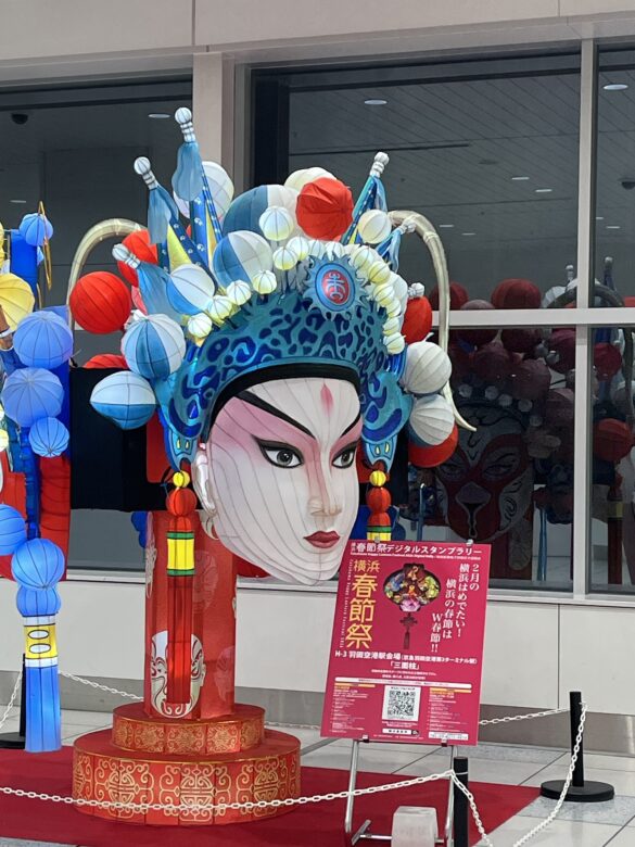 そうこうしているうちに、21:10くらいにカウンターが開いて、列が進み始めました。ふと見ると長蛇の列!!YouTube見てるうちにもうざっと100人弱くらいならんでるじゃないですか!なのにカウンターは2つしか開いてない。私は4人目くらいでしたからすぐにチェックインできたけど、片方がなんやかやで詰まろうものなら全然進まなくなります・・・これ、3時間前に来たら1時間の待ち時間とは思えません・・来年も絶対カウンター開く1時間前に来るぞと心に誓いながら空になったワゴンを片付けるのでした。身軽になったのですがまだ3時間もあります。少し羽田国際ターミナルをウロウロします。セブンイレブンでパスポートのコピーを取って、マツモトキヨシでメイク落としなどを買ったのですが、廊下にはでっかい春節の飾りが・・ラーメン屋さんやうどん屋さんは長蛇の列。もう21時過ぎなのでもちろんスルー。SORADONKI(ドンキ)をぶらつくのも飽きたので早めに出国することに。タイ航空のカウンターはまだ長蛇の列です。ひー!